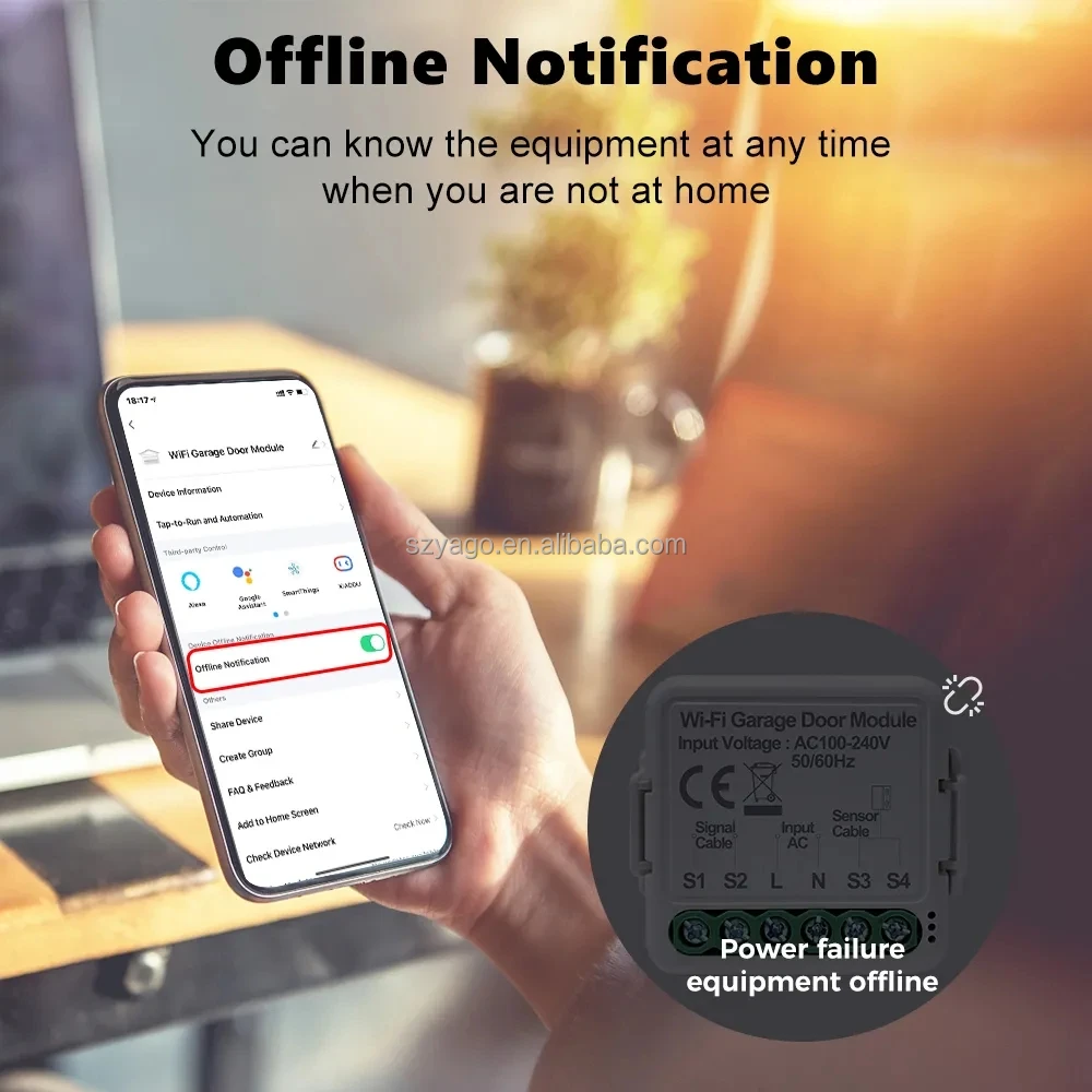 Điều khiển từ xa qua WiFi 2.4GHz: Mở/đóng cửa gara bằng điện thoại ở bất cứ đâu, miễn là có kết nối Internet.