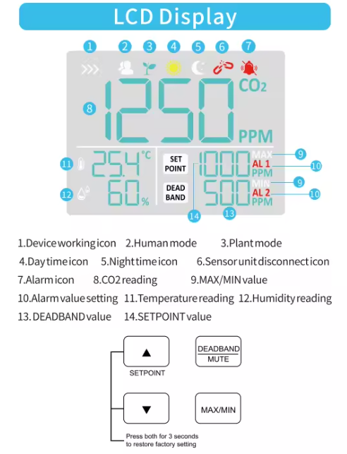 Âm báo và hiển thị cảnh báo khi nồng độ CO₂ vượt mức an toàn hoặc thấp hơn tiêu chuẩn đặt ra.