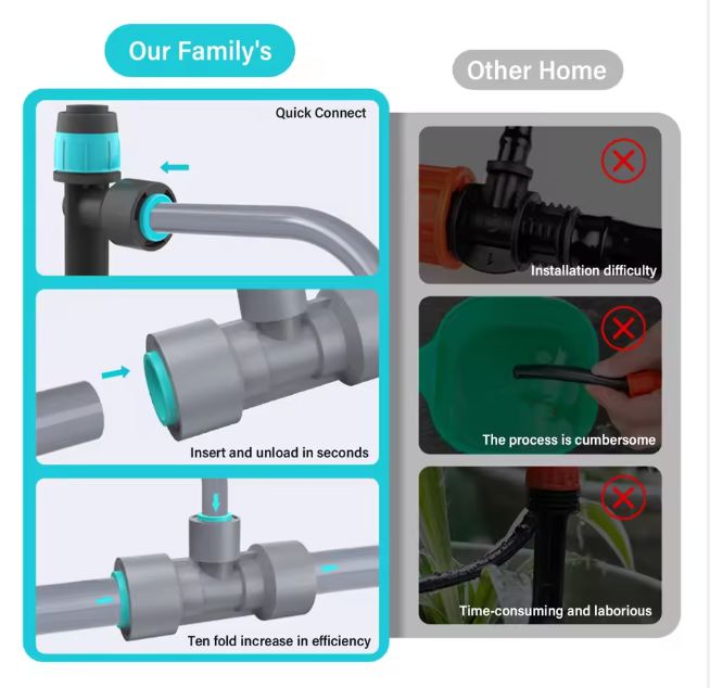Chỉ cần vài bước đơn giản là bạn có thể thiết lập một hệ thống tưới hoàn chỉnh. Các đầu nối nhanh giúp kết nối ống dẫn, chia nhánh và đầu tưới dễ dàng.