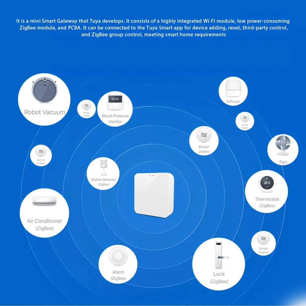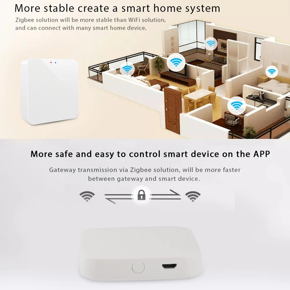 Trong nhà: làm cầu nối để các cảm biến cửa sổ, cảm biến chuyển động, công tắc thông minh, đèn, ổ cắm ZigBee có thể kết nối giữa nhau và với ứng dụng Tuya/Smart Life.