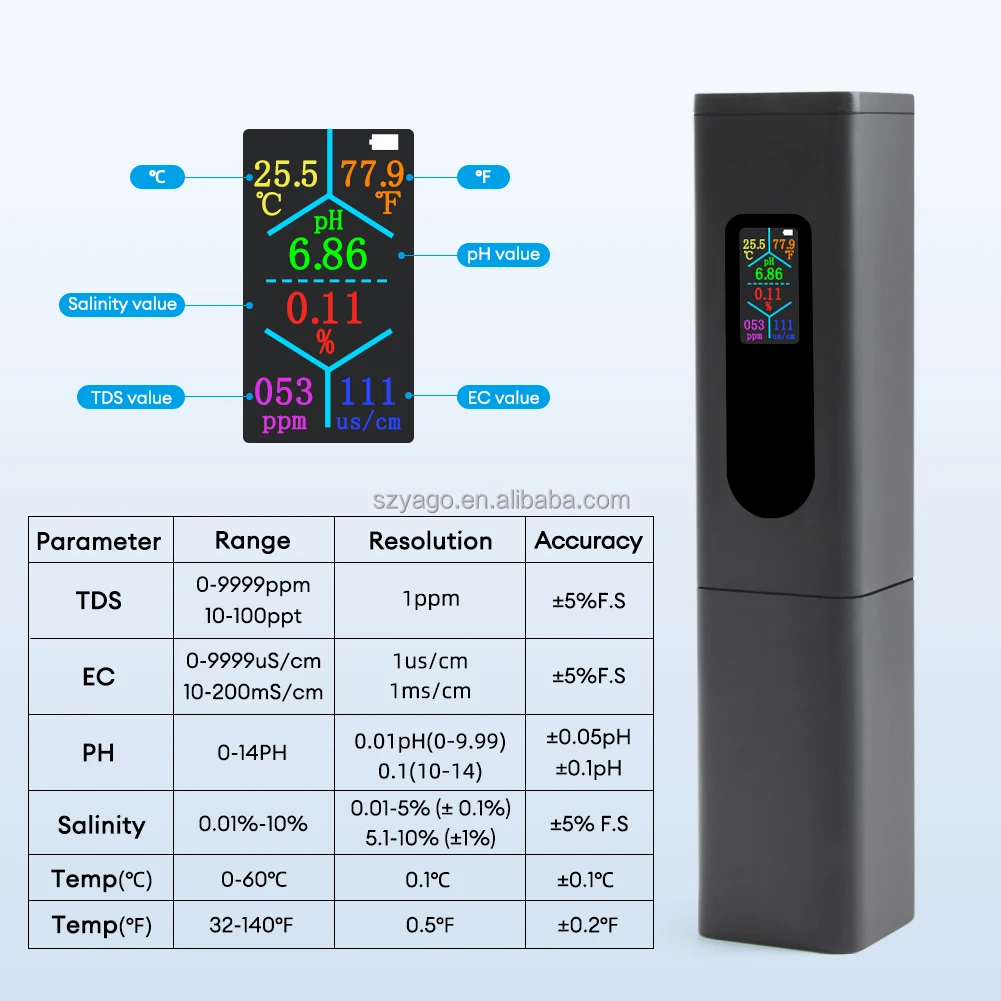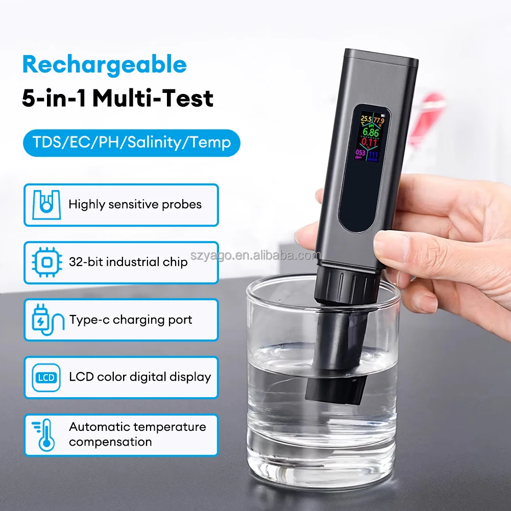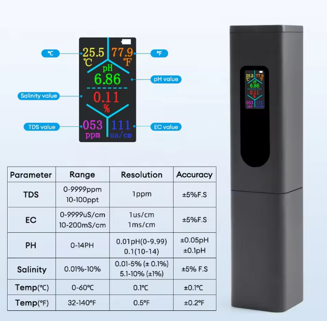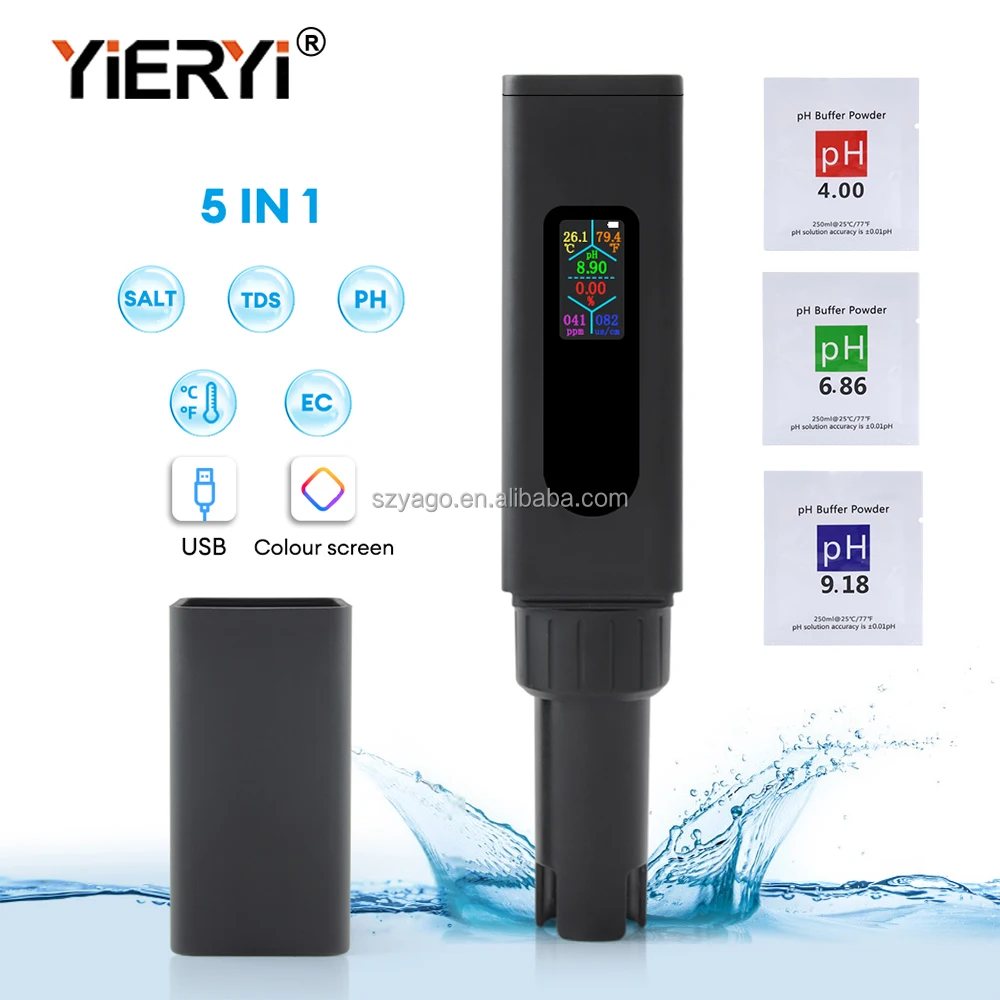 Đáp ứng những tiêu chí này, YIERYI THE01858 là bút đo nước kỹ thuật số 5-trong-1 được thiết kế với màn hình màu sắc nét, hỗ trợ sạc USB, và độ chính xác cao, giúp bạn đo pH, EC, TDS, độ mặn và nhiệt độ nước chỉ trong vài giây.