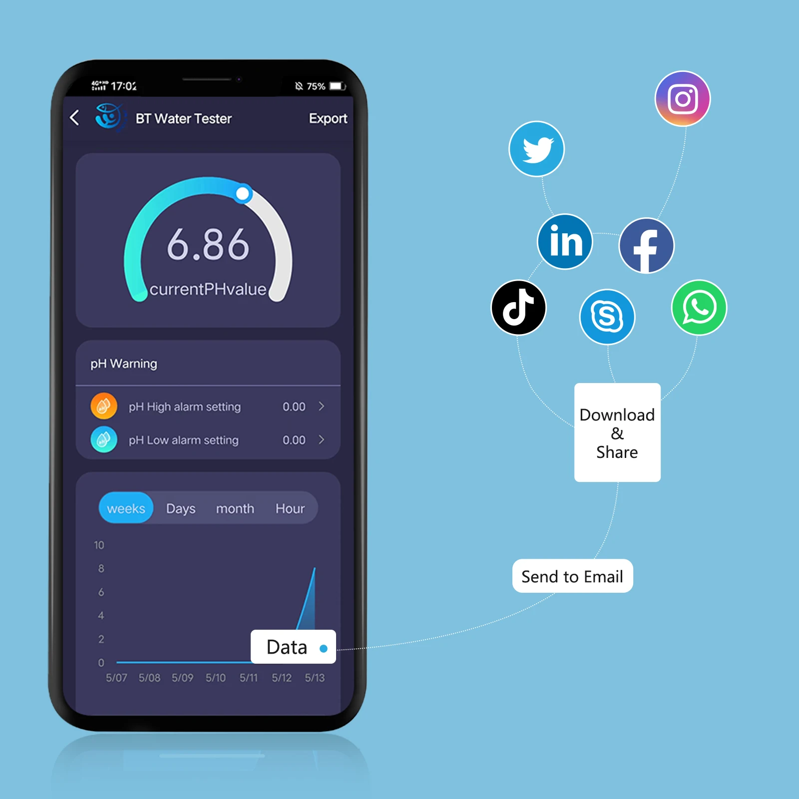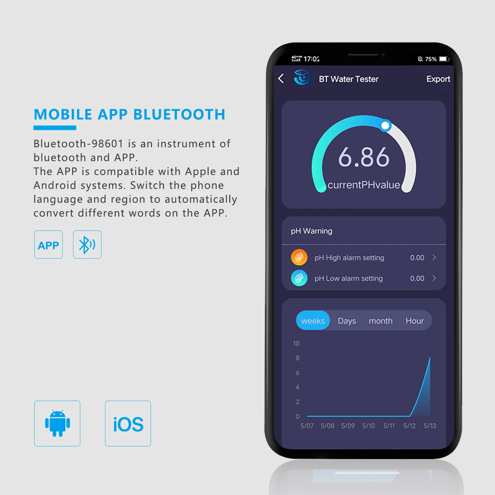 Đầu dò thủy tinh chất lượng cao giúp đo chính xác đến ±0.1 pH, ổn định và bền bỉ trong thời gian dài.Bluetooth Kết Nối Ứng Dụng Đa Ngôn Ngữ (App Multi-language)