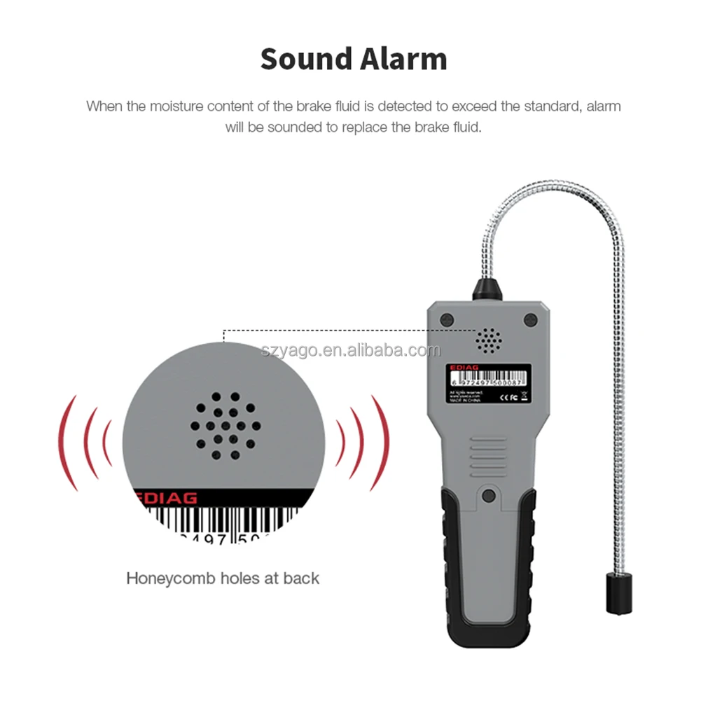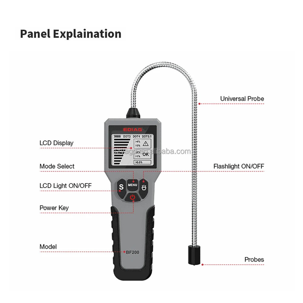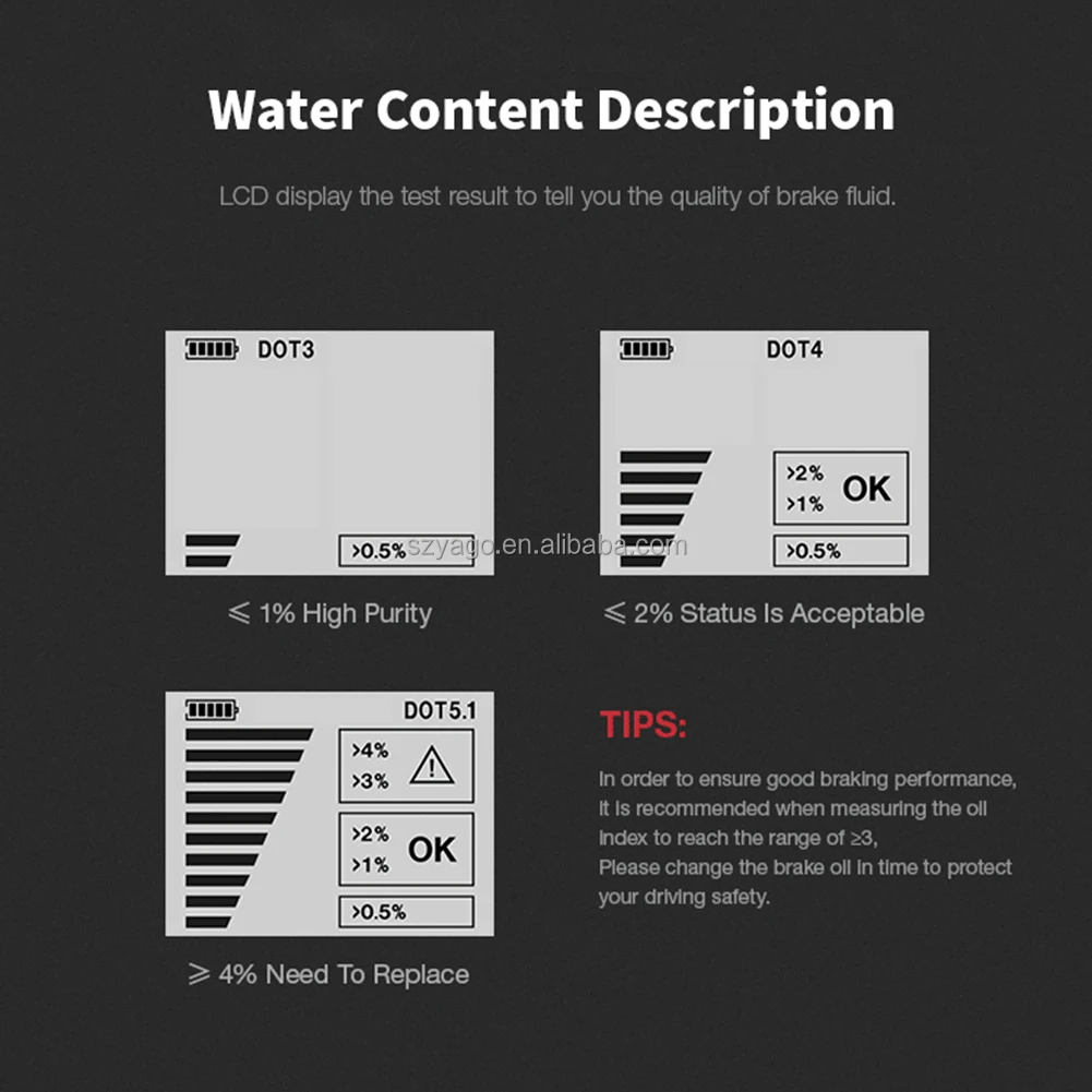 Thiết bị sử dụng nguyên lý đo điện dẫn, phát hiện lượng hơi nước tồn tại trong dầu phanh và hiển thị kết quả trên màn hình độ phân giải cao (LCD).