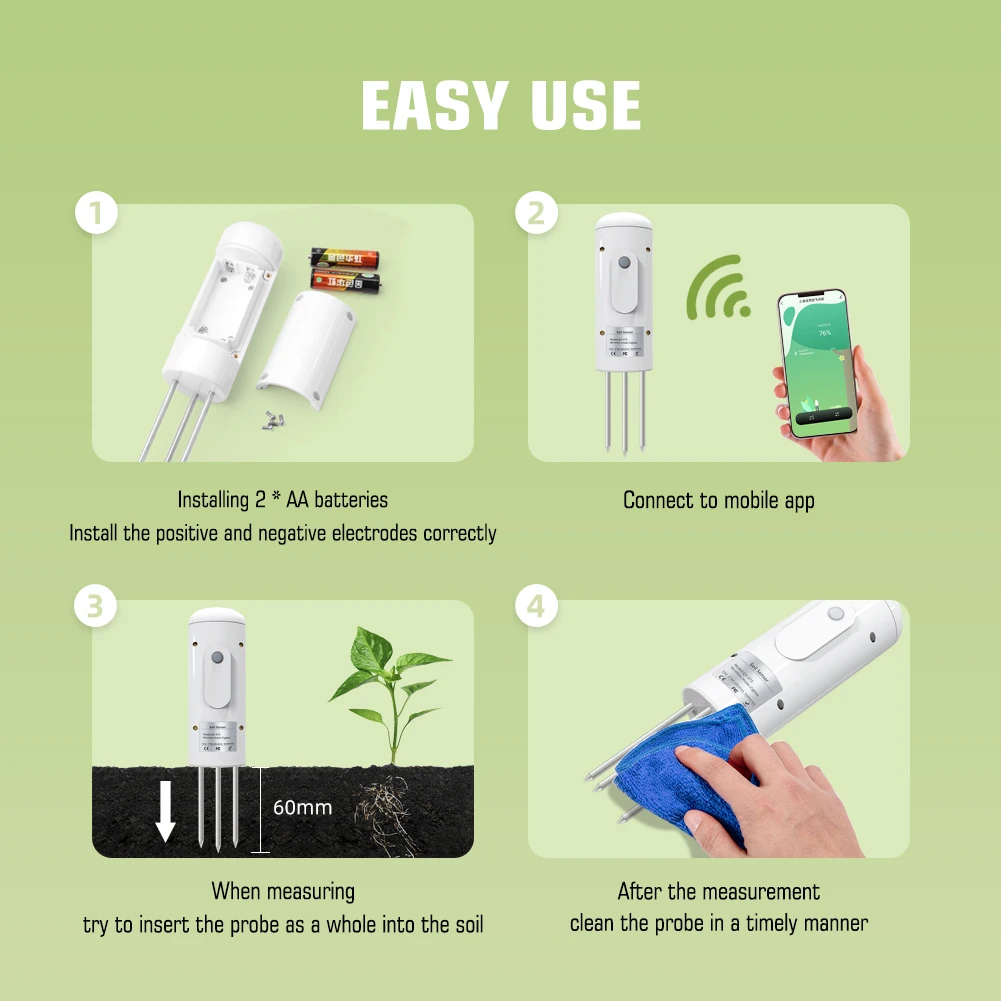 Dữ liệu được truyền về ứng dụng Tuya Smart / Smart Life mỗi 60 giây, đảm bảo người dùng luôn nắm được trạng thái đất theo thời gian thực.Chuẩn chống nước IP67 – hoạt động bền bỉ ngoài trời