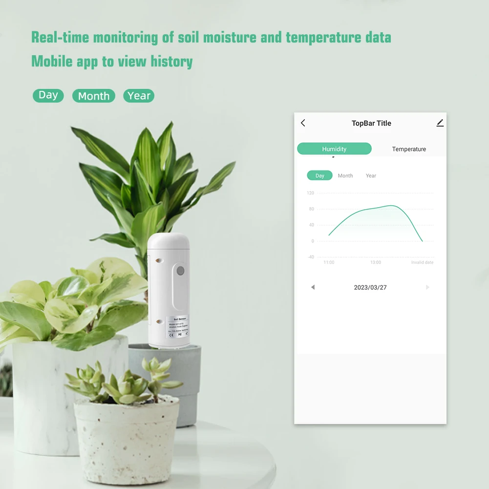 Cảm biến truyền dữ liệu độ ẩm và nhiệt độ đất trực tiếp lên ứng dụng, cho phép bạn:Theo dõi tình trạng đất theo thời gian thực.