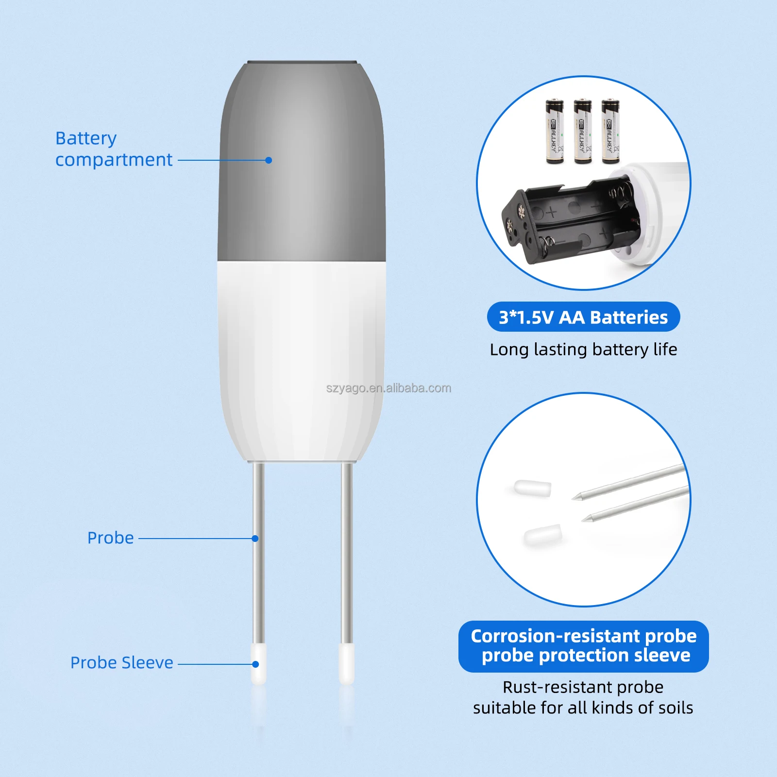 Chỉ cần cắm cảm biến xuống đất, cấp nguồn bằng 3 viên pin AA (dễ mua và thay thế). Thời gian sử dụng dài nhờ WiFi tiêu thụ năng lượng thấp.