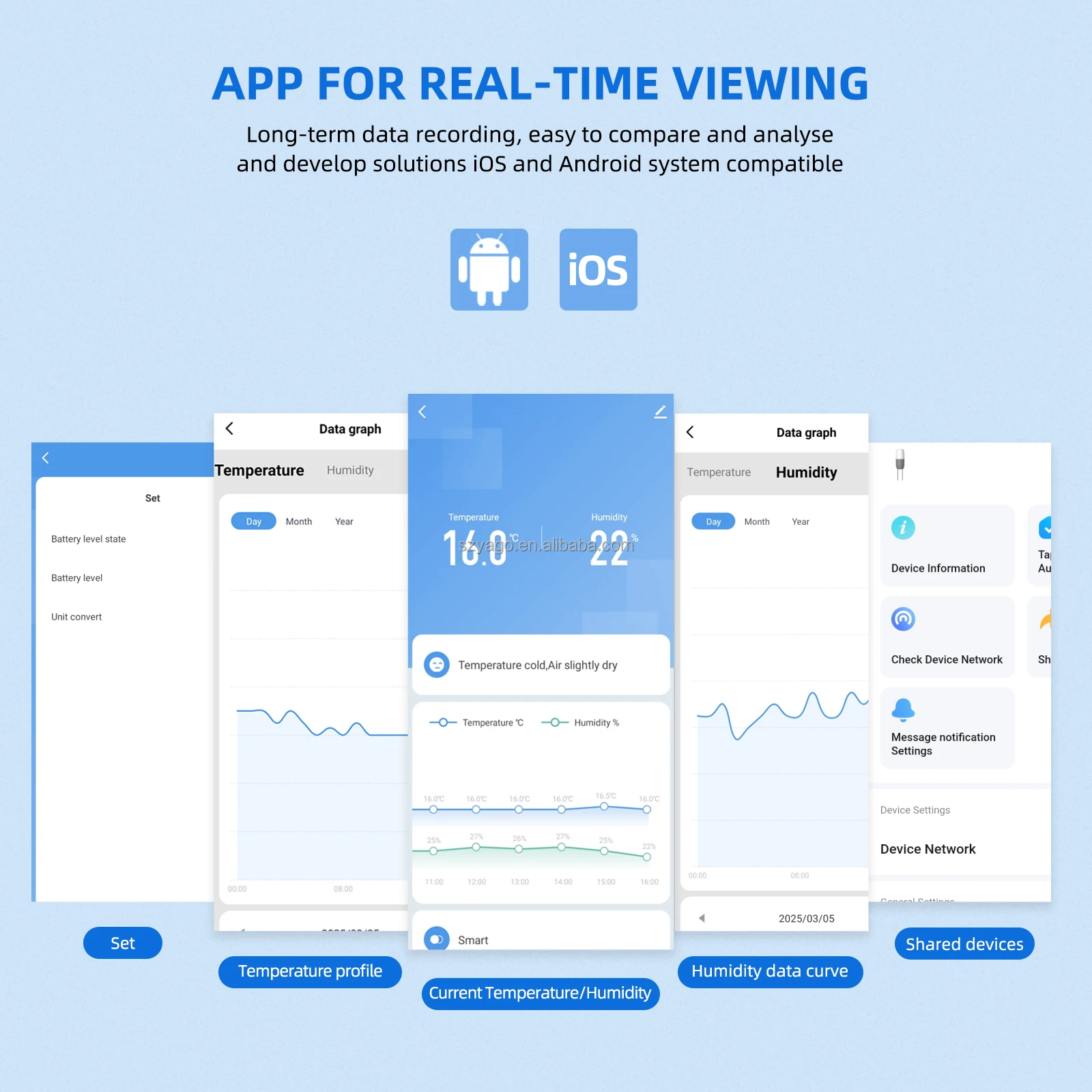 Theo dõi dữ liệu: Mở app để xem độ ẩm, nhiệt độ và cài đặt cảnh báo.
