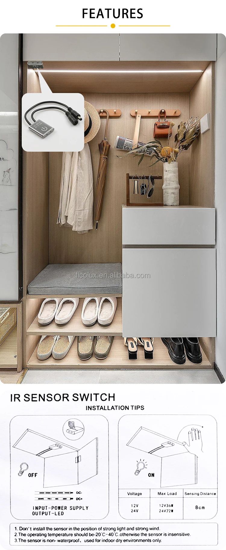 • Chuyển đổi hồng ngoạiFVD01-A(Sau đây IR chuyển đổi) bao gồm của một đơn vị điện tử và một cảm biến Hồng Ngoại (IR cảm biến), khi một đối tượng (ví dụ: Một nội các cửa) là trong vòng các khu vực phát hiện của cảm biến HỒNG NGOẠI, việc cung cấp điện là không được cung cấp để tải (Ánh sáng là OFF); Nếu có là không có đối tượng trong vòng các khu vực phát hiện của cảm biến HỒNG NGOẠI, việc cung cấp điện áp được áp dụng cho các tải (ánh sáng là trên).