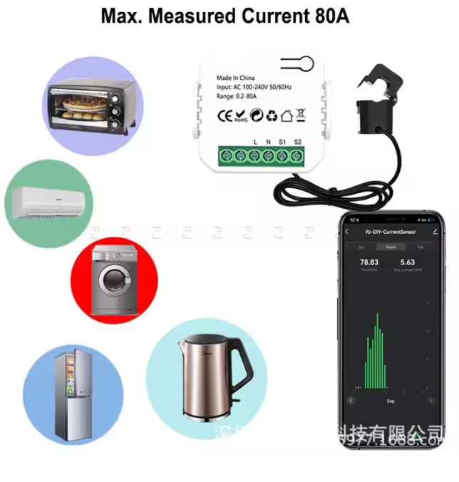 Điểm đặc biệt của sản phẩm là việc sử dụng cảm biến kẹp dòng (Current Transformer – CT Clamp), cho phép đo dòng điện mà không cần cắt dây hoặc đấu nối trực tiếp vào nguồn chính, đảm bảo an toàn tuyệt đối trong quá trình lắp đặt và sử dụng.