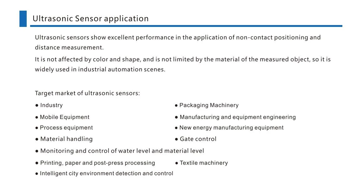 Kjt siêu âm sensorhas hành động đáng tin cậy, hiệu suất ổn định, đáp ứng tần số nhanh, tuổi thọ dài và khả năng chống nhiễu mạnh mẽ. Nó được sử dụng rộng rãi trong máy công cụ, luyện kim, công nghiệp hóa chất, dệt nhẹ, in ấn và các ngành công nghiệp khác. Kích thước tổng thể, cáp và khoảng cách phát hiện của sản phẩm có thể được tùy chỉnh. Công tắc lân cận được sản xuất bởi nanjing kjt Electric co., LTD hoàn toàn có thể thay thế các thương hiệu chuyển đổi lân cận nhập khẩu như turck, Omron và P + F.