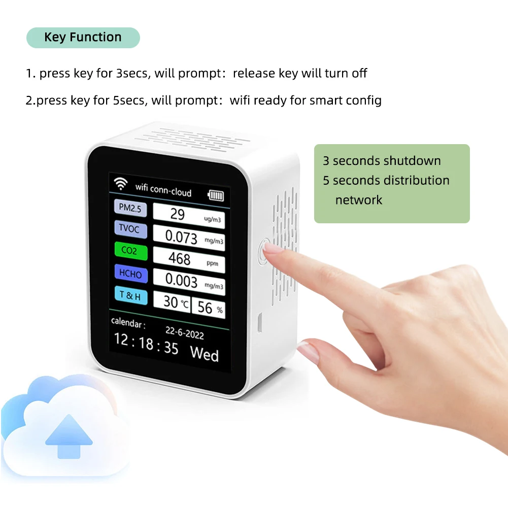 Với khả năng đo đồng thời PM2.5, CO₂, formaldehyde, TVOC, nhiệt độ và độ ẩm, cùng kết nối WiFi – giám sát qua điện thoại, sản phẩm giúp bạn bảo vệ sức khỏe, nâng cao chất lượng sống và tiết kiệm năng lượng.