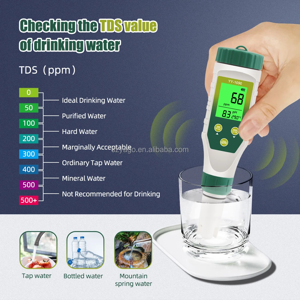 YY-1090 đo được pH, EC, TDS, độ mặn (Salinity) và nhiệt độ chỉ trong vài giây:pH (0–14): xác định tính axit/kiềm của nước.