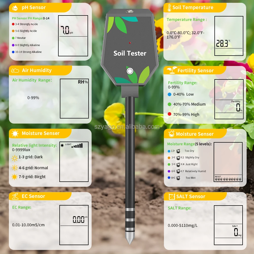 - Máy Đo Đất Thông Minh 8 Trong 1 YAGO YY-1088W – Đo Độ Mặn, Độ Phì, pH, Ánh Sáng, Độ Ẩm, Nhiệt Độ & Độ Ẩm Không Khí