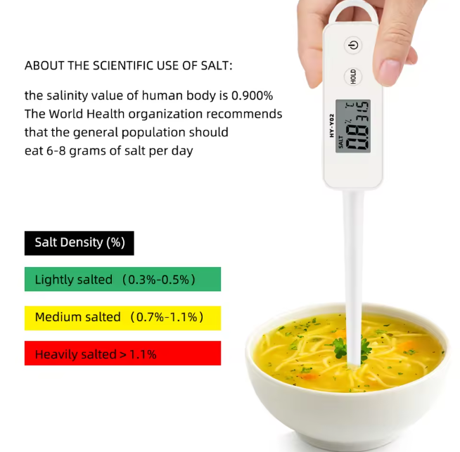 YIERYI HY-Y02 là máy đo độ mặn kỹ thuật số nhỏ gọn, có màn hình LCD hiển thị rõ nét, giúp người dùng dễ dàng kiểm tra nồng độ muối trong nước, canh, súp, bể cá hoặc ao nuôi tôm cá một cách nhanh chóng và chính xác.