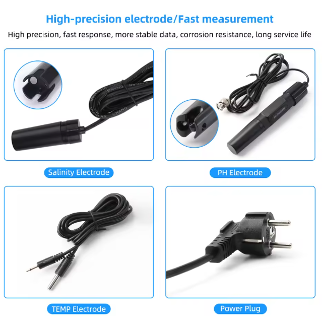 Thiết bị tích hợp 3 cảm biến chính: pH (độ axit-kiềm), Salinity (độ mặn), và Temperature (nhiệt độ), giúp người dùng có cái nhìn tổng quan và tức thời về môi trường nước.