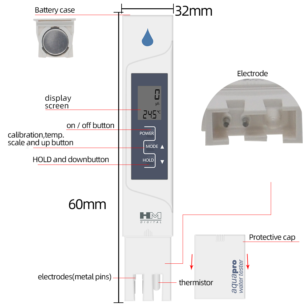 HM AP-2 Chất Lượng Nước Tester Kỹ Thuật Số 2 trong 1 Nhiệt Độ EC Meter