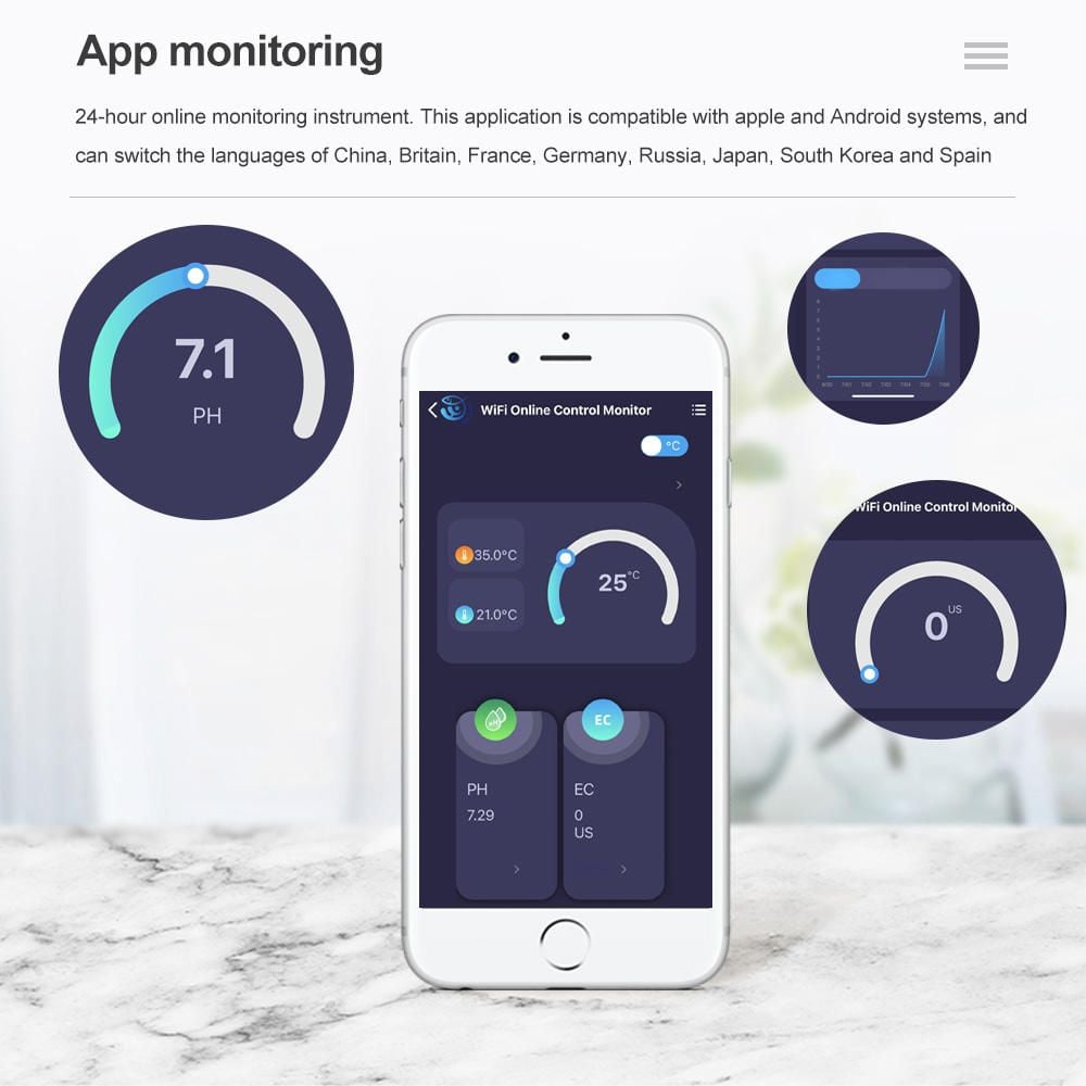 2. Nó hỗ trợ ỨNG DỤNG điều khiển từ xa, thuận tiện hơn để màn hình chất lượng nước Tester bất cứ lúc nào bất cứ nơi nào. Bạn cũng có thể tạo ra Thông Minh Cảnh và thiết lập giá trị báo động trong ỨNG DỤNG.
