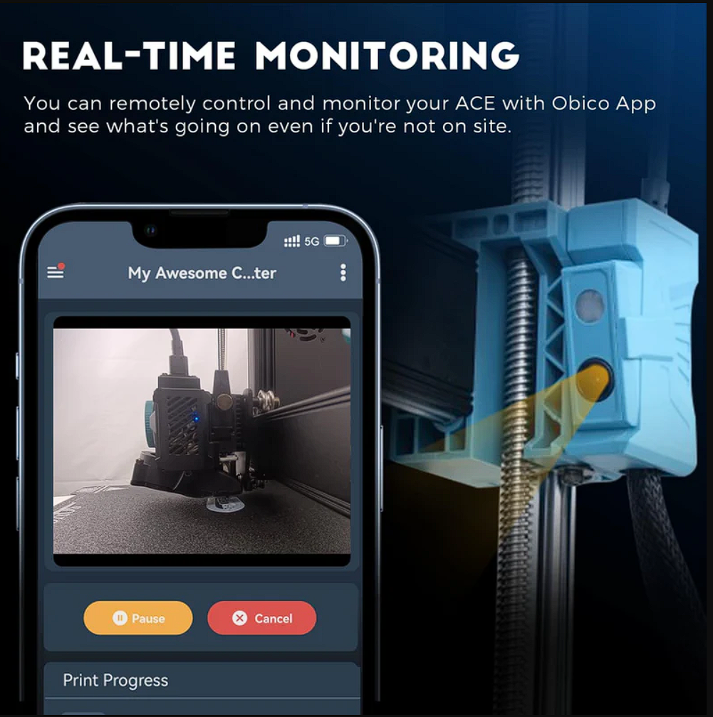 SV06 ACE được trang bị camera cho phép theo dõi quá trình in theo thời gian thực. Ngoài ra, máy còn có chức năng quay phim time-lapse, cho phép quan sát và ghi lại chi tiết quá trình in, mang lại sự tiện lợi và cái nhìn sâu sắc về trải nghiệm in ấn.