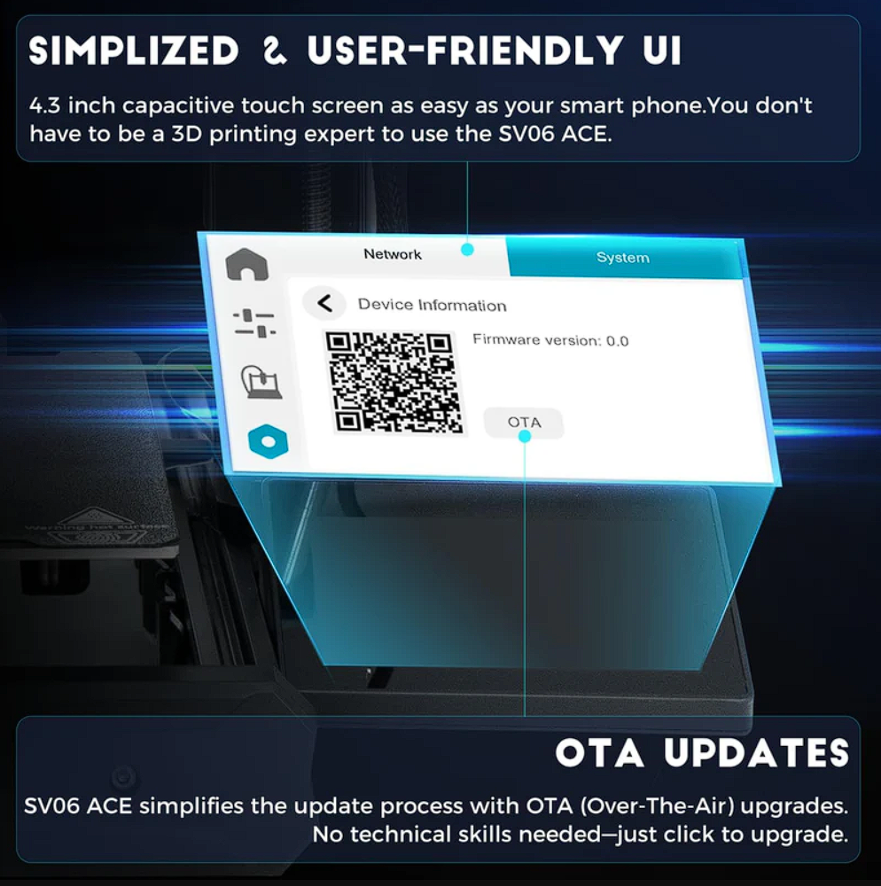 SV06 ACE đơn giản hóa quy trình cập nhật với tính năng nâng cấp qua mạng (OTA), cho phép người dùng dễ dàng nâng cao chức năng máy in. Không yêu cầu kỹ năng chuyên môn —chỉ cần một cú nhấp chuột là có thể cài đặt các tính năng và cải tiến mới nhất . Tận hưởng trải nghiệm mượt mà và cập nhật máy in dễ dàng.