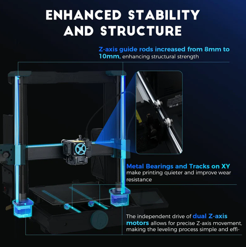 Được trang bị động cơ trục Z kép dẫn động độc lập , cho phép điều khiển chính xác chuyển động thẳng đứng. Thiết kế này giúp đơn giản hóa quá trình cân bằng, giúp đạt được kết quả in tối ưu dễ dàng và hiệu quả hơn. Trải nghiệm độ ổn định được cải thiện và chất lượng in được nâng cao với hệ thống điều khiển trục Z tiên tiến này.