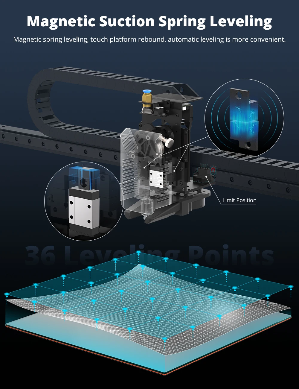 Cảm biến độ cao chính xác giúp tự cân chỉnh mặt bàn, đảm bảo lớp in đầu tiên luôn đều và bám chắc.