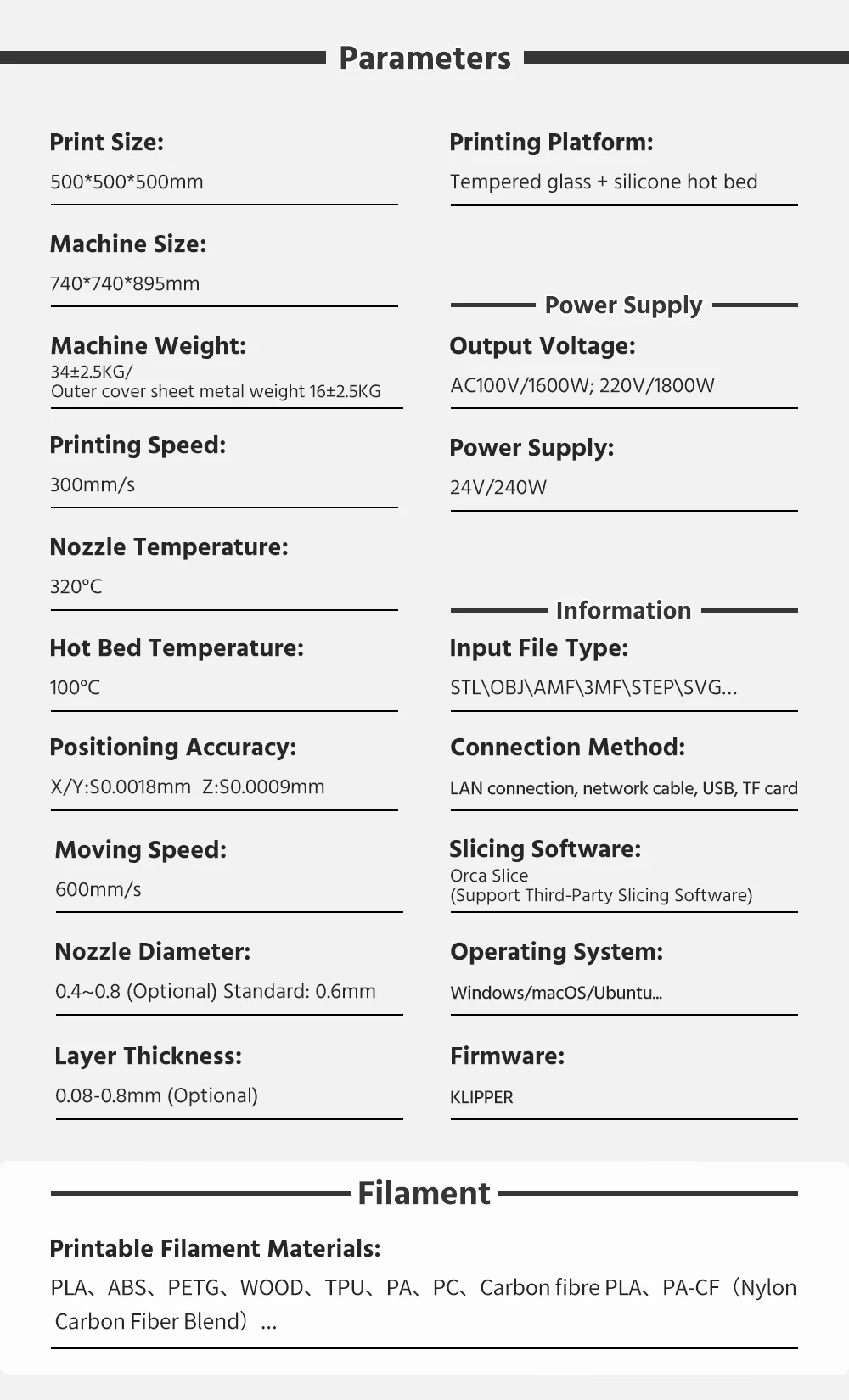 --- PLA、ABS、PETG、WOOD、TPU、PA、PC、Sợi carbonPLA、PA-CF(NyIon Carbon FiberBlend)… chấp nhận vật liệu