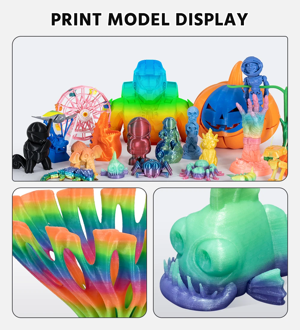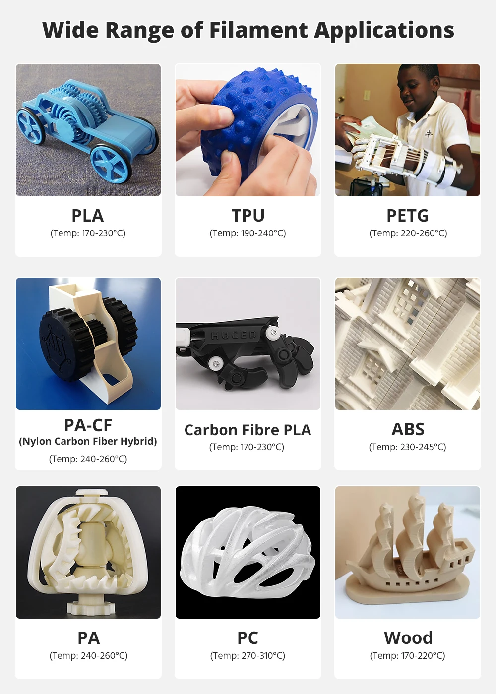 Hỗ trợ đa vật liệu: PLA, ABS, PETG, TPU, Nylon, ASA, Carbon Fiber, Wood...