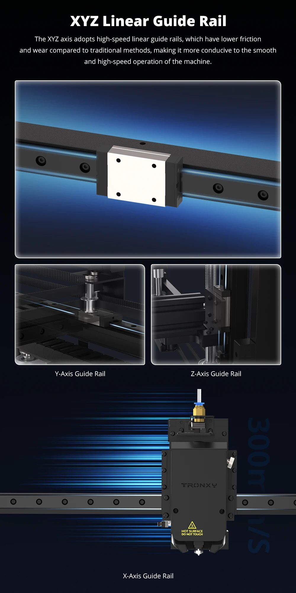 Hệ thống dẫn hướng tuyến tính (linear rail) giúp chuyển động mượt, chính xác và bền hơn dây đai thông thường.
