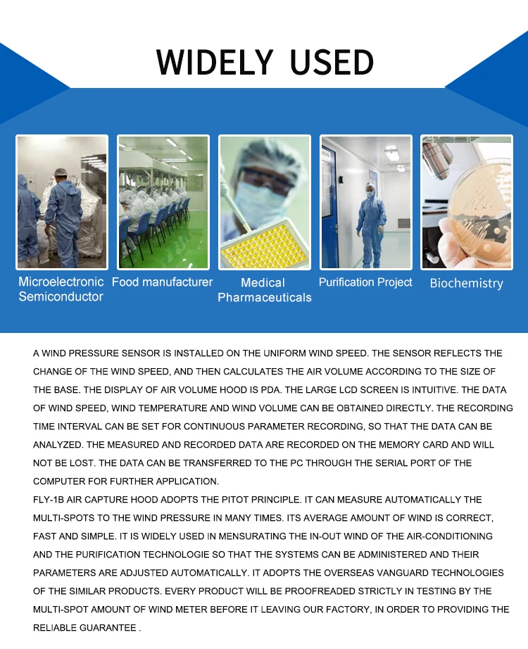 FLY - 1 B loại đo lưu lượng không khí sử dụng Ống Pitot loại nguyên tắc, thực hiện trên các áp lực gió, nhiều lần hơn Tự động phát hiện, sản xuất các trung bình Khối lượng (m3 / h) có những đặc điểm của bên phải, nhanh chóng, đơn giản, sử dụng rộng rãi trong HVAC, Thanh lọc và các ngành công nghiệp khác cho trực tiếp xác định của các ống bể và đường ống Khối lượng không khí, như vậy là để thực hiện toàn diện quản lý cho không khí trung tâm điều hòa không khí dòng chảy và các thông số chẳng hạn như nhiệt độ, độ ẩm, sự sạch sẽ của điều khiển tự động. Trong đặt hàng để tạo thuận lợi cho trên trang web kiểm tra của khách hàng, chúng tôi có đặc biệt được trang bị với điện thoại di động hỗ trợ, mà có thể được nâng lên lên đến 2.2m (bao gồm cả 0.9m của không khí cơ thể đồng hồ) và 3.1m tổng thể. FLY loại Air Meter có thể được sử dụng để đo lường không khí cung cấp Ổ Cắm và không khí trở lại cửa hàng, mà mang lại sự tiện lợi để các bài kiểm tra. Nhà máy của chúng tôi theo các tiên tiến của nước ngoài công nghệ của sản phẩm tương tự, các đầu tiên để khởi động các sản xuất của sản phẩm này trong Trung Quốc, và thu được bằng sáng chế quốc gia. Mỗi FLY loại khối lượng không khí mét được phân phối bởi nghiêm ngặt 0.5 cấp độ tiêu chuẩn đường hầm gió Thiết bị hiệu chuẩn đối với Multi-điểm Khối lượng không khí điều chỉnh, cung cấp đáng tin cậy đảm bảo cho người sử dụng để trực tiếp đo khối lượng không khí