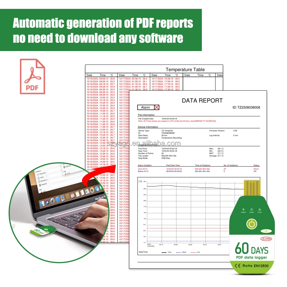 Khi hoàn tất hành trình (hoặc hết thời hạn ghi), thiết bị được kết nối qua USB, tự động sinh báo cáo chi tiết gồm: biểu đồ nhiệt độ, thời gian, điểm cảnh báo vượt ngưỡng.